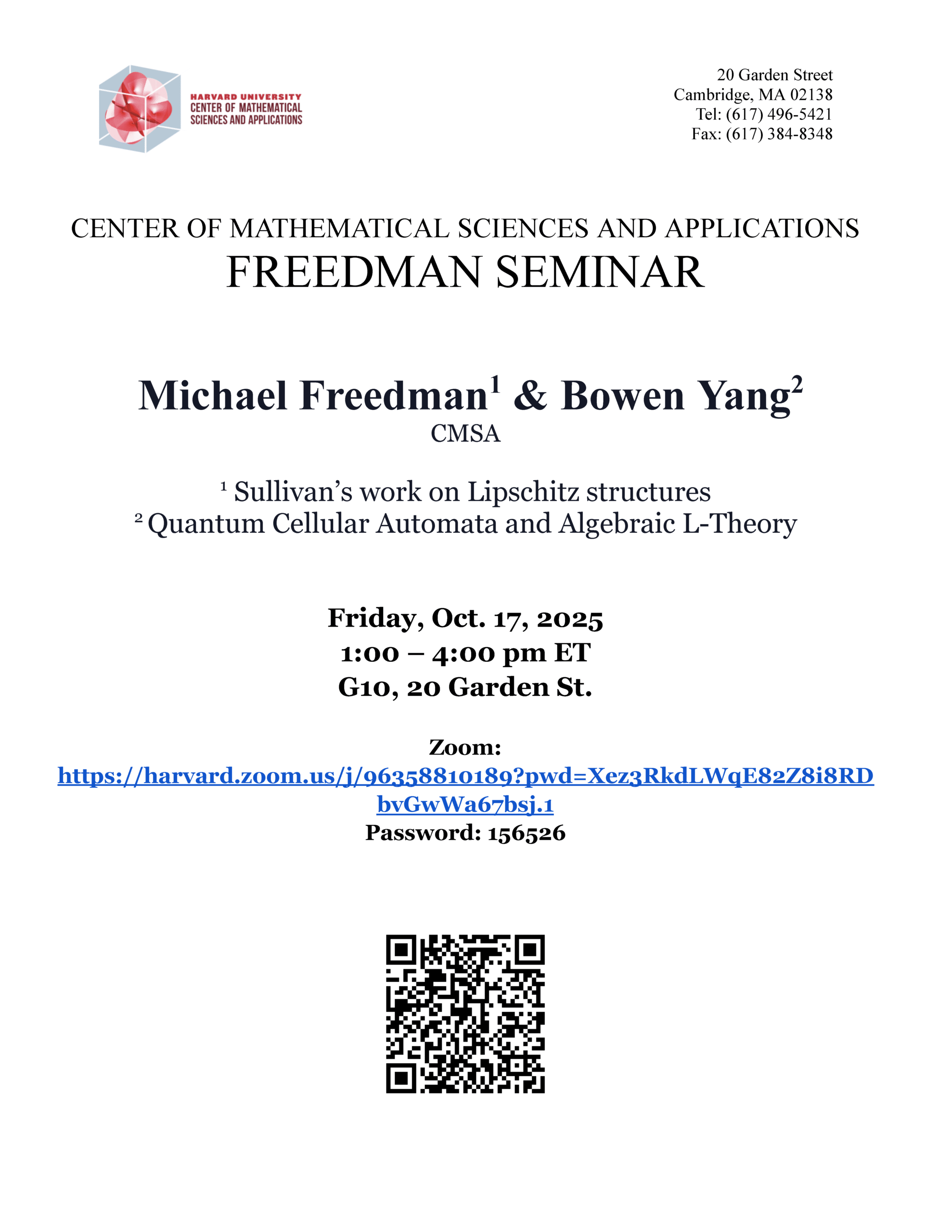 CMSA Spring Welcome Back Event Date: Jan 28, 2026 Time: 4:00 pm Location: CMSA Common Room, 20 Garden Street, Cambridge MA All CMSA and Math affiliates are invited. |