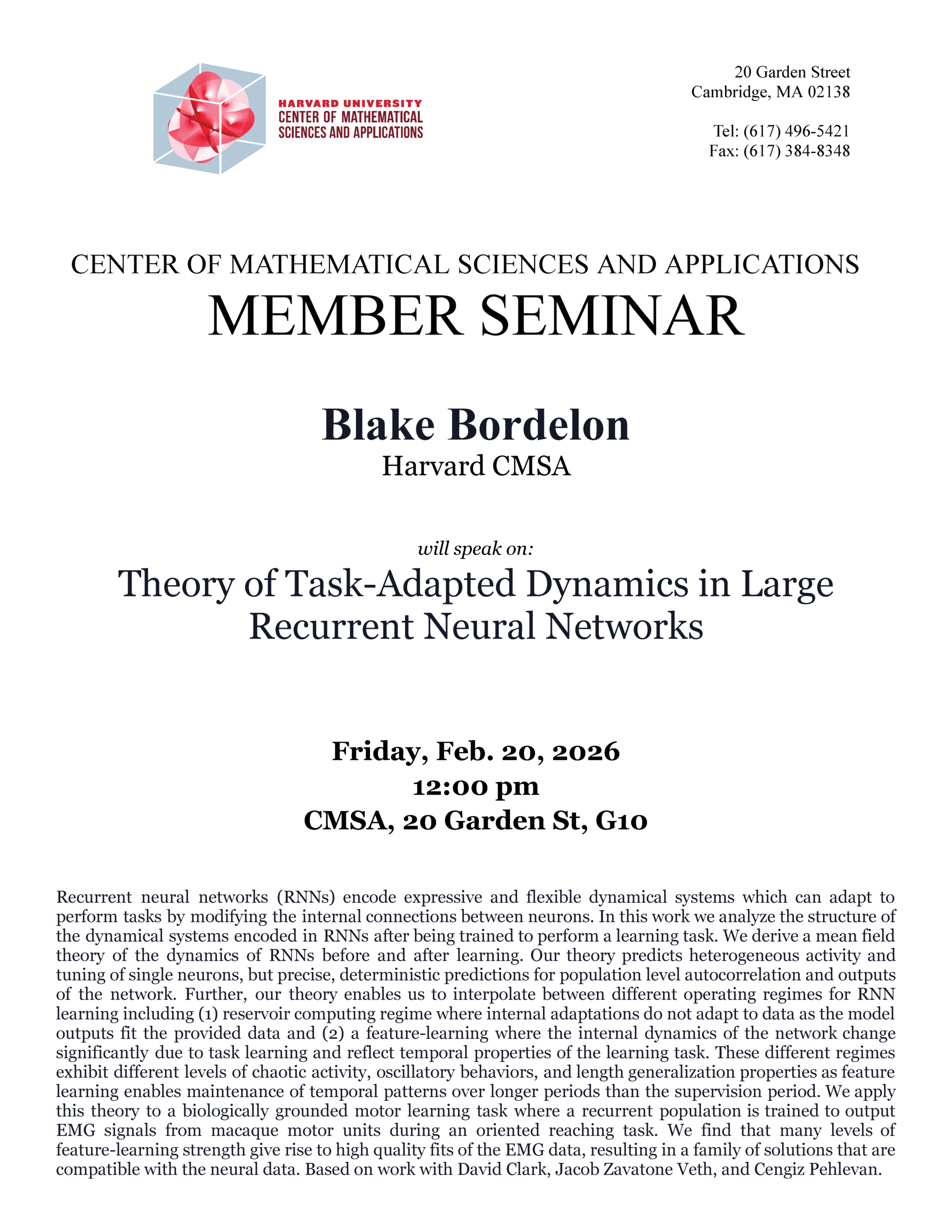 Member Seminar Speaker: Blake Bordelon, CMSA Title: Theory of Task-Adapted Dynamics in Large Recurrent Neural Networks Abstract: Recurrent neural networks (RNNs) encode expressive and flexible dynamical systems which can adapt […]