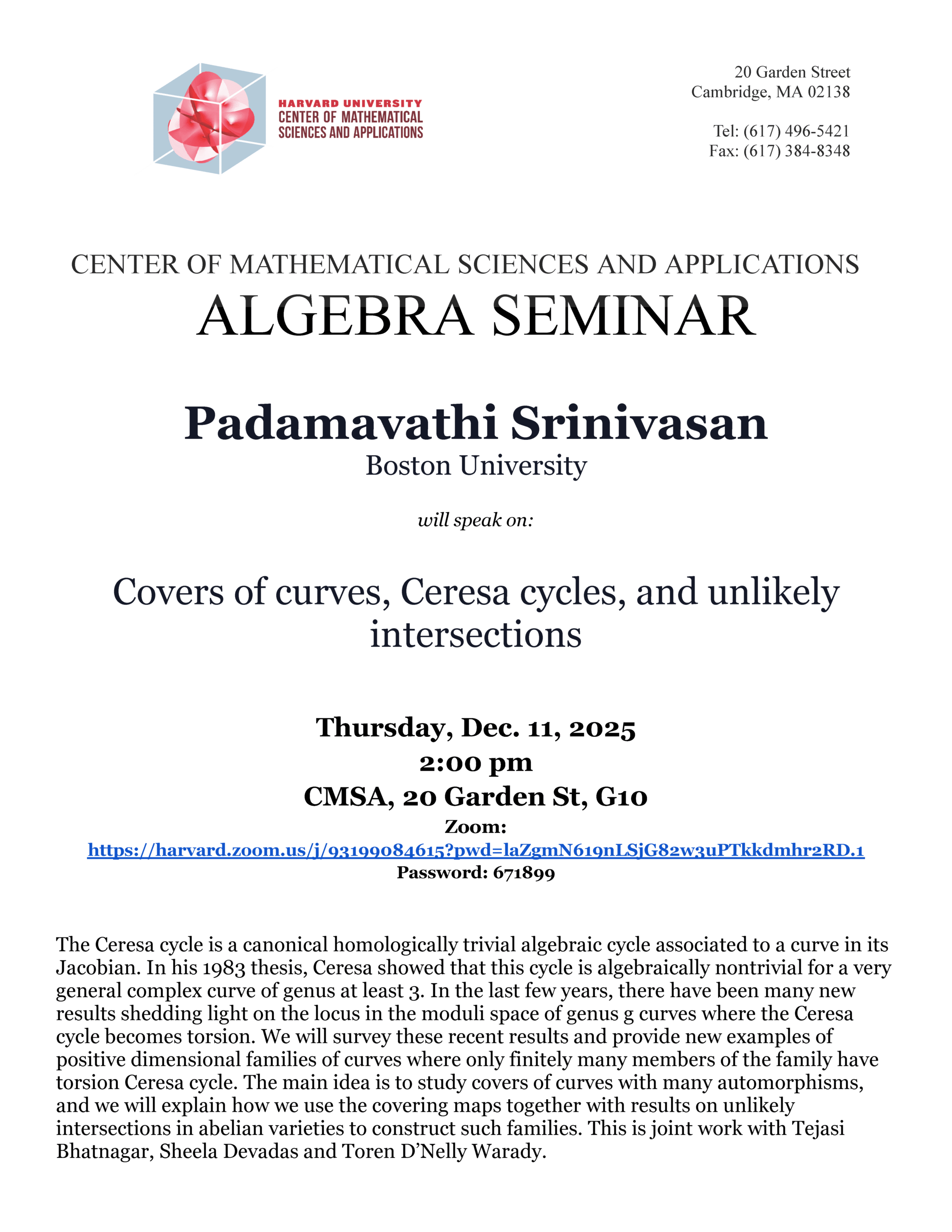 Abstract: The Ceresa cycle is a canonical homologically trivial algebraic cycle associated to a curve in its Jacobian. In his 1983 thesis, Ceresa showed that this cycle is algebraically nontrivial for a very general complex curve of genus at least 3. In the last few years, there have been many new results shedding light on the locus in the moduli space of genus g curves where the Ceresa cycle becomes torsion. We will survey these recent results and provide new examples of positive dimensional families of curves where only finitely many members of the family have torsion Ceresa cycle. The main idea is to study covers of curves with many automorphisms, and we will explain how we use the covering maps together with results on unlikely intersections in abelian varieties to construct such families. This is joint work with Tejasi Bhatnagar, Sheela Devadas and Toren D’Nelly Warady.