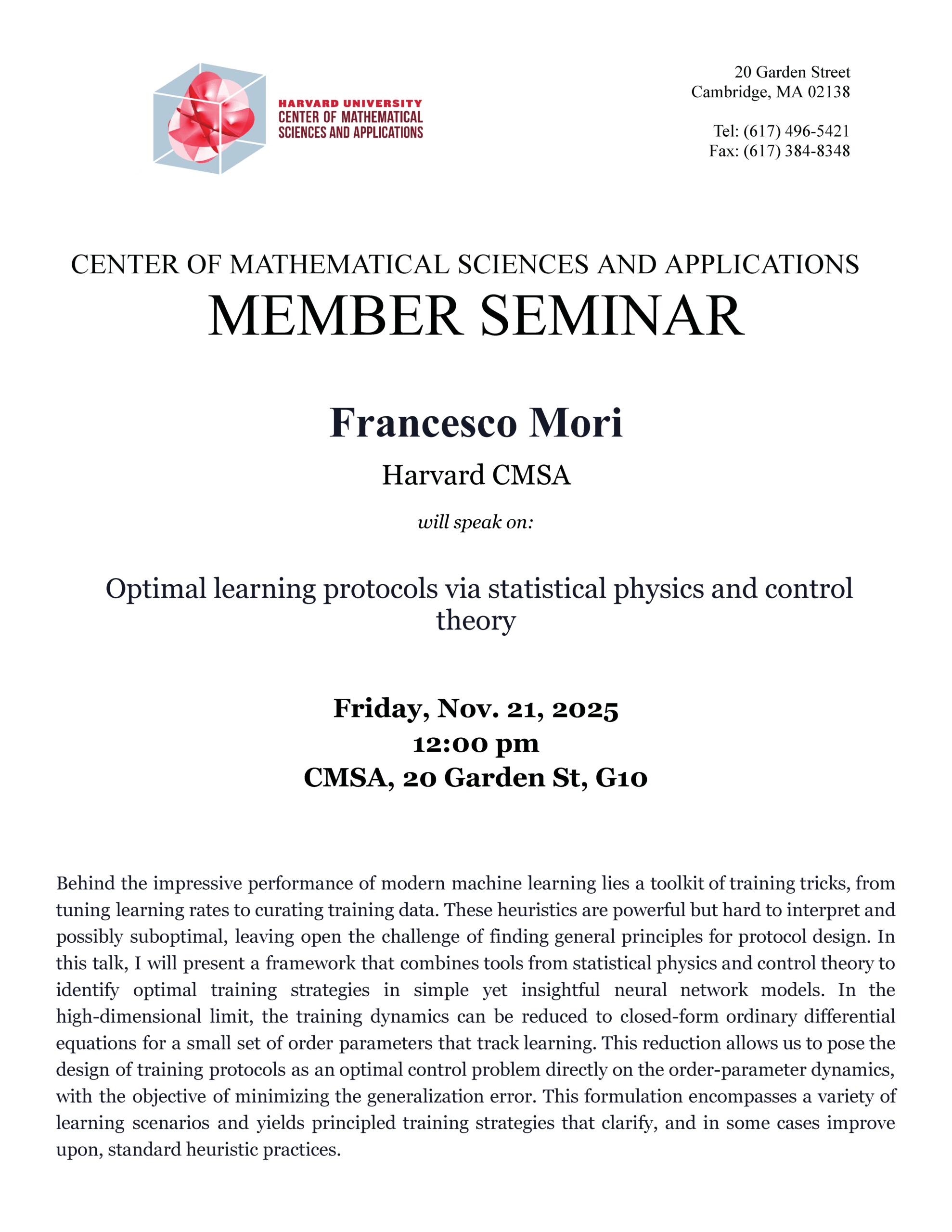 Abstract: Behind the impressive performance of modern machine learning lies a toolkit of training tricks, from tuning learning rates to curating training data. These heuristics are powerful but hard to interpret and possibly suboptimal, leaving open the challenge of finding general principles for protocol design. In this talk, I will present a framework that combines tools from statistical physics and control theory to identify optimal training strategies in simple yet insightful neural network models. In the high-dimensional limit, the training dynamics can be reduced to closed-form ordinary differential equations for a small set of order parameters that track learning. This reduction allows us to pose the design of training protocols as an optimal control problem directly on the order-parameter dynamics, with the objective of minimizing the generalization error. This formulation encompasses a variety of learning scenarios and yields principled training strategies that clarify, and in some cases improve upon, standard heuristic practices.