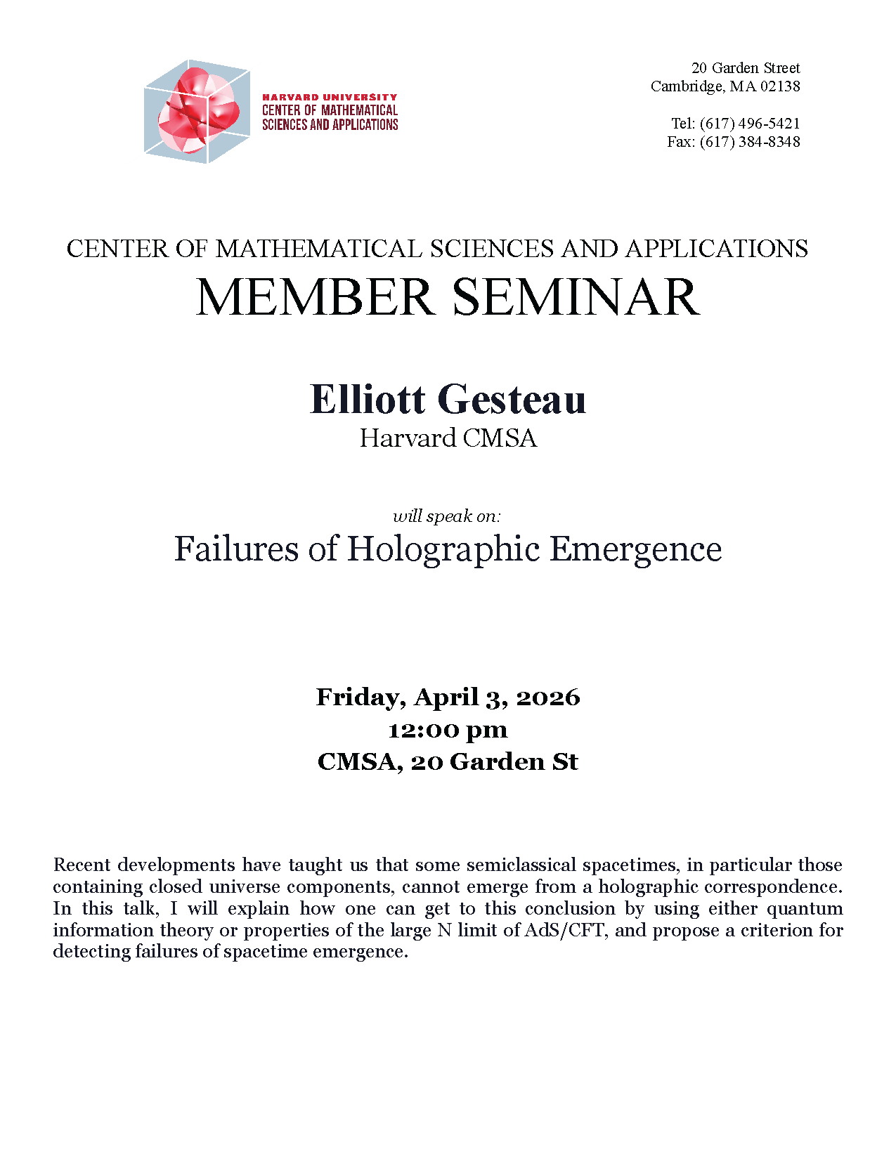Member Seminar Speaker: Elliott Gesteau, CMSA Title: Failures of Holographic Emergence Abstract: Recent developments have taught us that some semiclassical spacetimes, in particular those containing closed universe components, cannot emerge from a holographic correspondence. […]