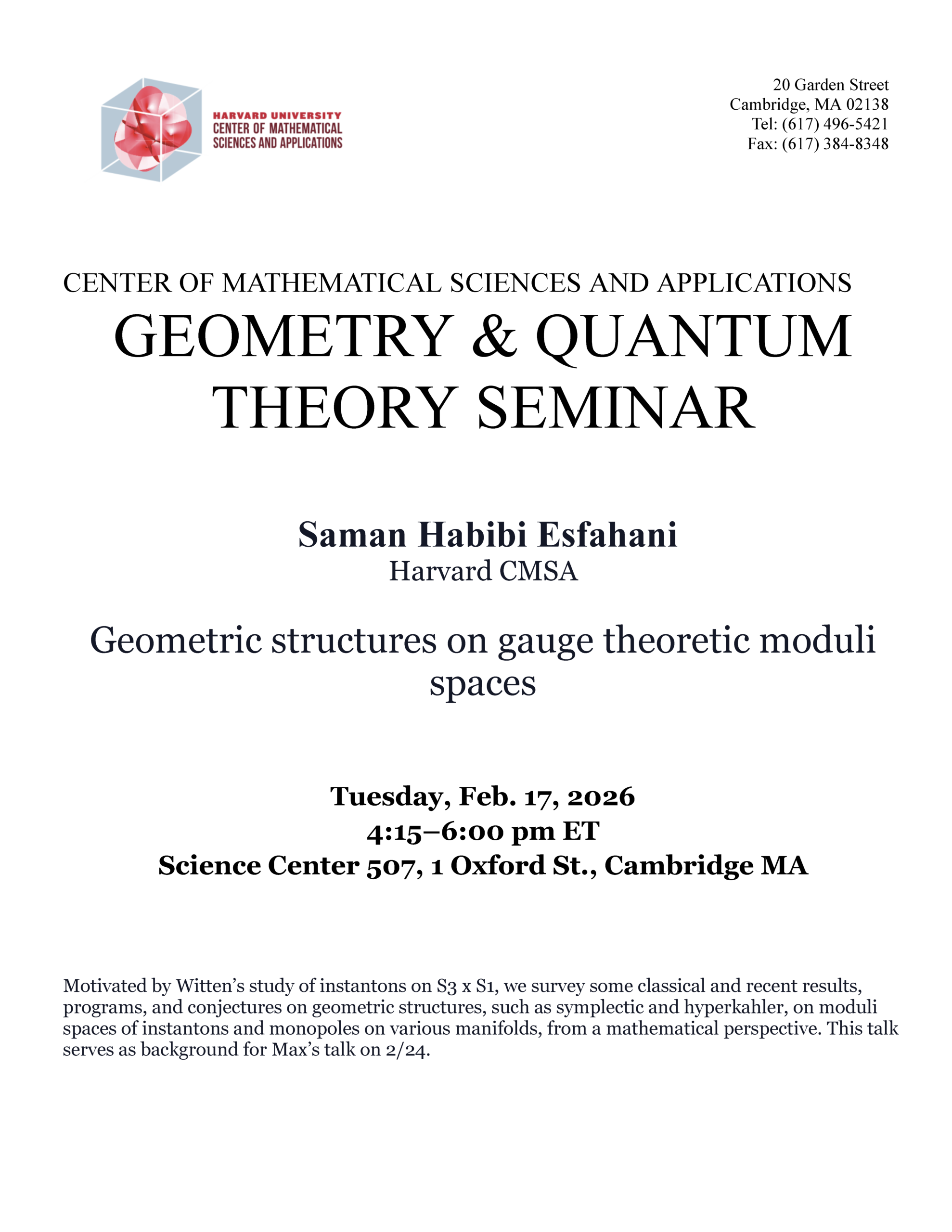 Geometry and Quantum Theory Seminar Speaker: Saman Habibi Esfahani (CMSA) Title: Geometric structures on gauge theoretic moduli spaces Abstract: Motivated by Witten’s study of instantons on S3 x S1, we survey […]
