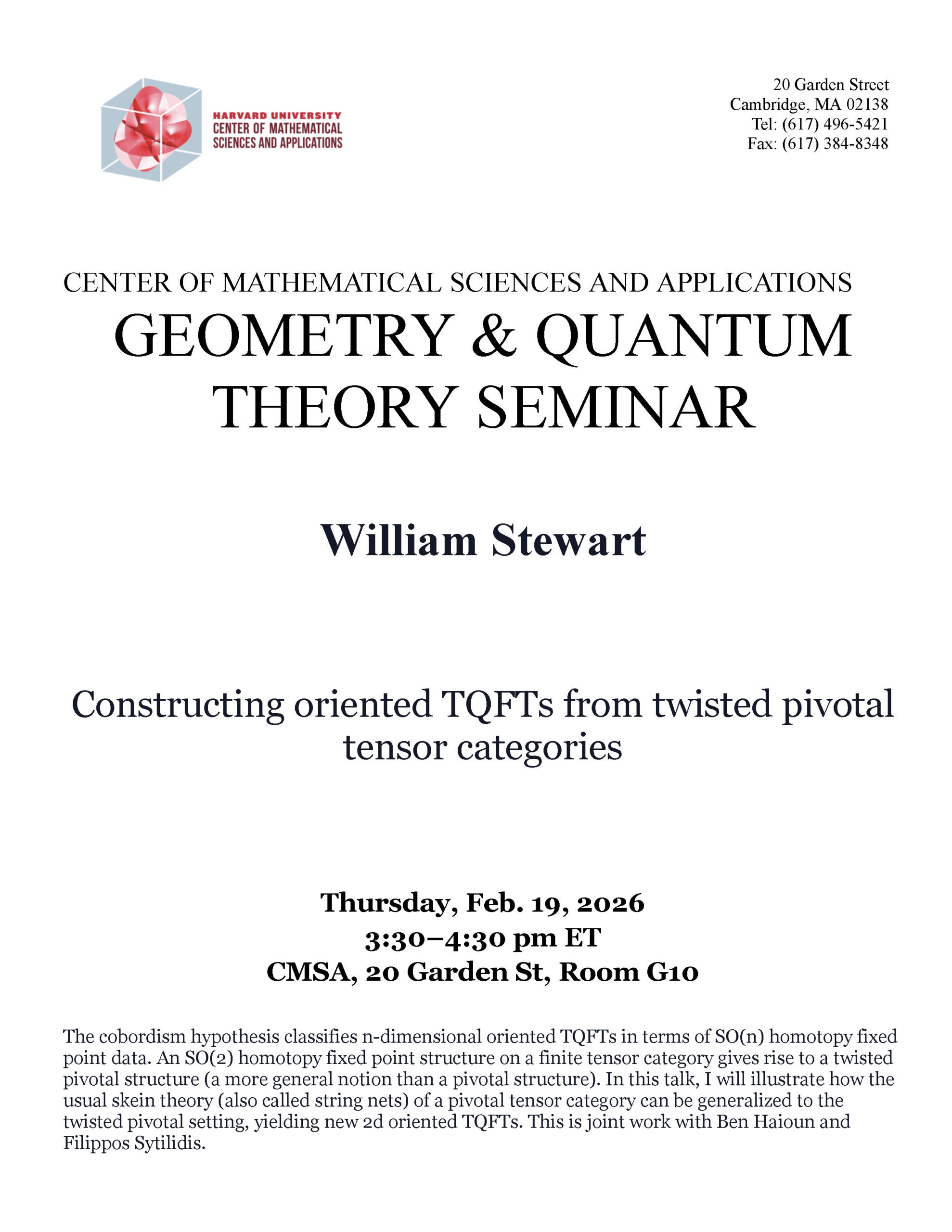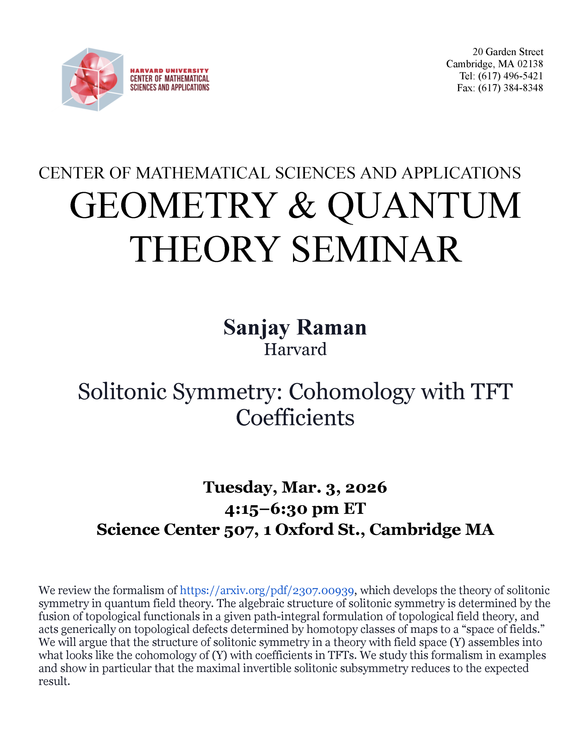 Science Center 507 1 Oxford Street, CambridgeGeometry and Quantum Theory Seminar Speakers: Max Hübner and Saman Habibi Esfahani