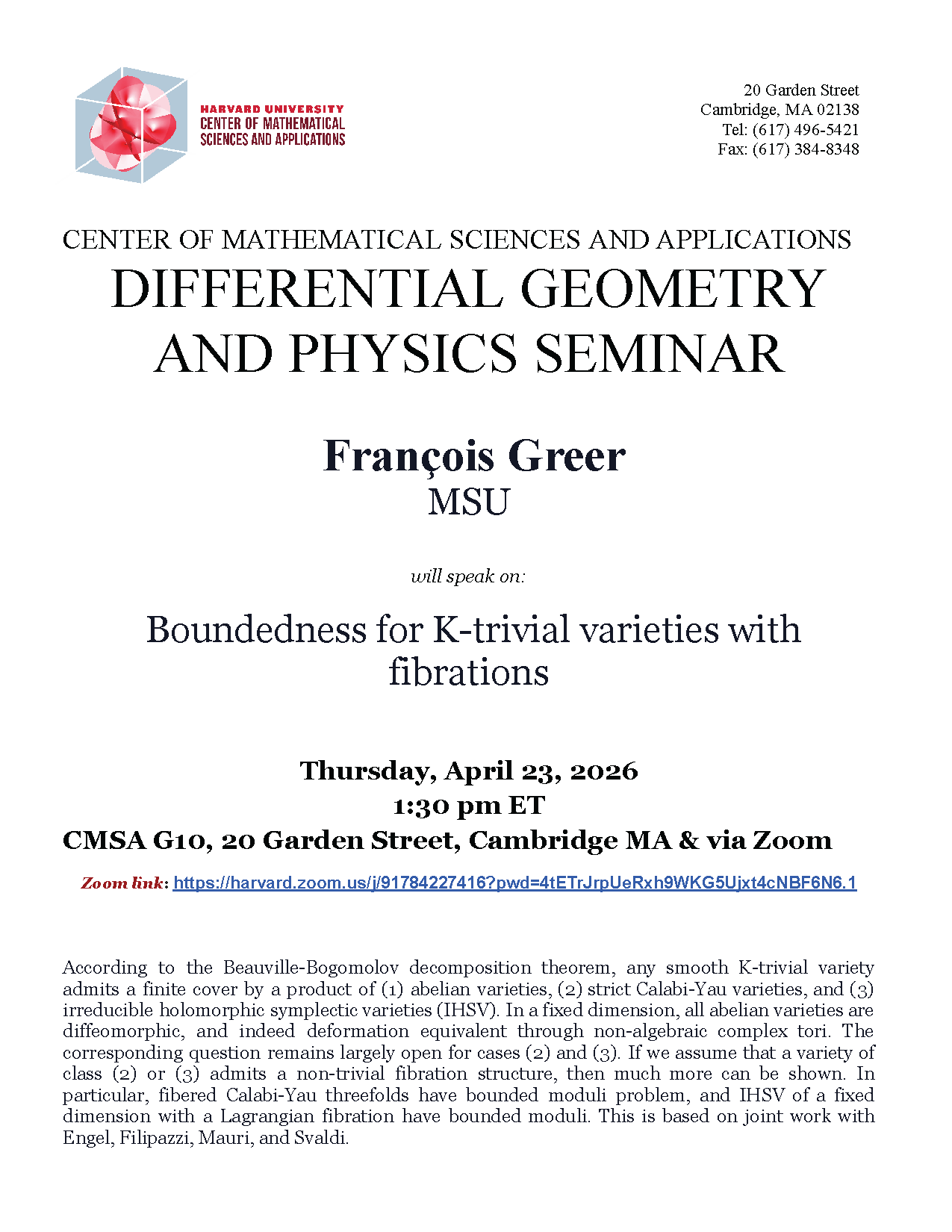 CMSA/Tsinghua Math-Science Literature Lecture Date: April 22, 2026 Time: 9:00 - 10:30 am ET Location: via Zoom Webinar Speaker: Nicolai Reshetikhin, Yau Mathematical Sciences Center, Tsinghua University Title: Asymptotic representation theory […]