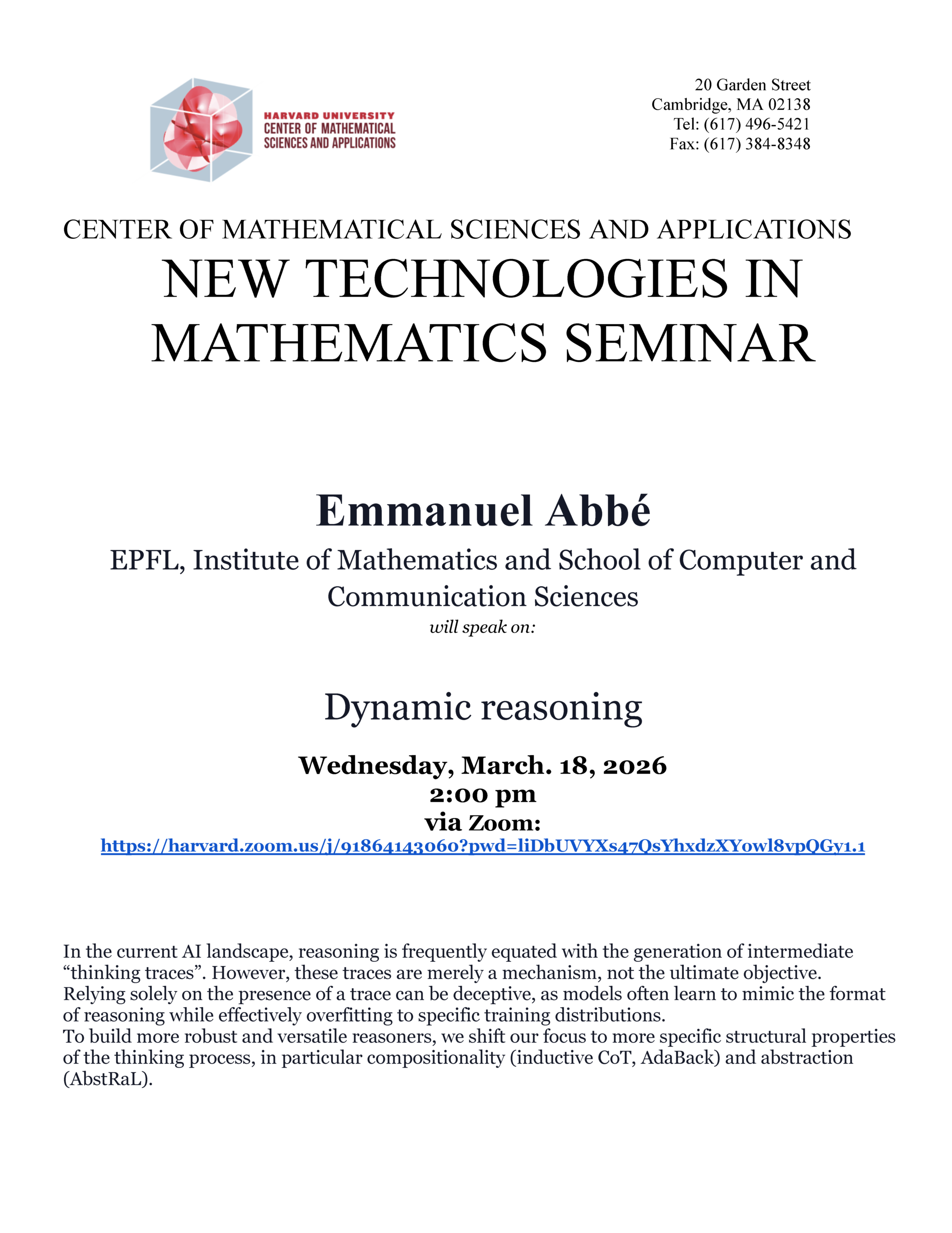 New Technologies in Mathematics Seminar Speaker: Emmanuel Abbé, EPFL, Institute of Mathematics and School of Computer and Communication Sciences Title: Dynamic reasoning Abstract: In the current AI landscape, reasoning is frequently equated […]