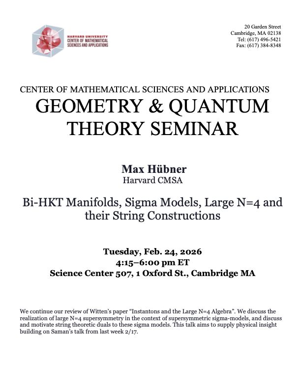 CMSA Room G10 CMSA, 20 Garden Street, Cambridge, MA, United StatesMember Seminar Speaker: Lorenzo Riva, Harvard CMSA Title: A leisurely stroll through the theory of adjunctions Abstract: Adjoint functors (and, more generally, adjunctions in a 2-category) are ubiquitous in algebra […]