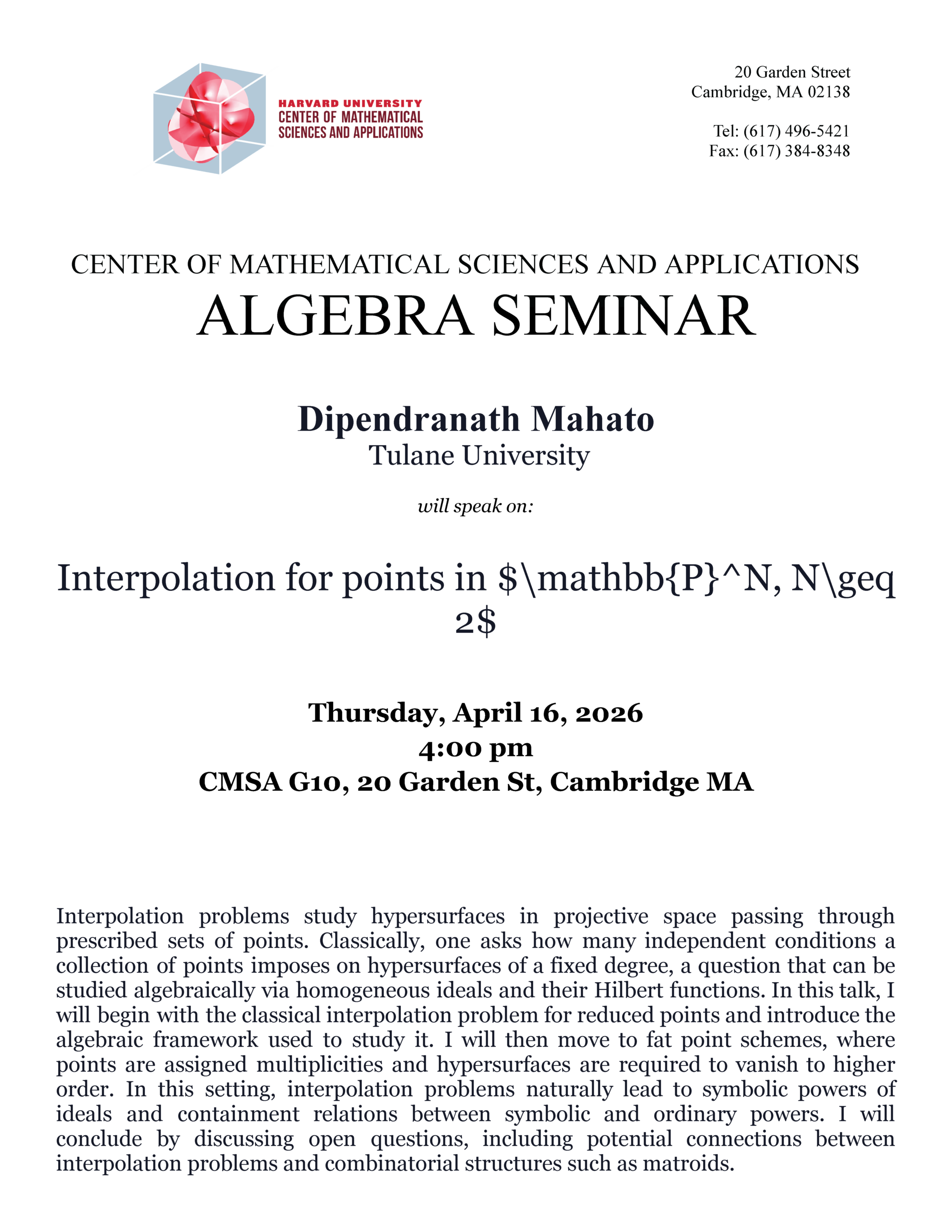 Algebra Seminar Speaker: Matt Broe, Boston University Title: The Beilinson-Bloch conjecture for some non-isotrivial varieties over global function fields Abstract: The Beilinson-Bloch conjecture is a generalization of the Birch and Swinnerton-Dyer conjecture, which relates the ranks of Chow groups of smooth projective varieties over global fields to the order of vanishing of L-functions. We prove […]